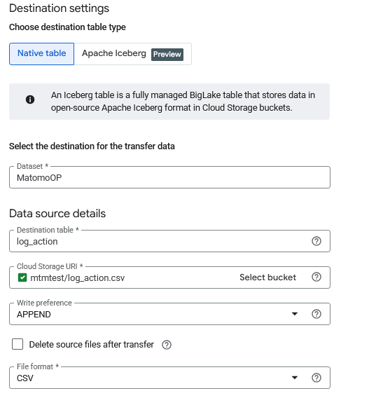 - Configure the Schedule options to run the data transfer from the bucket to the table. The data transfer service automatically imports data from your Cloud Storage bucket into BigQuery on a schedule. However, it does not extract or update your MySQL data automatically. To keep your BigQuery dataset current, you must regularly export new or updated data from your Matomo database and upload it to the bucket.